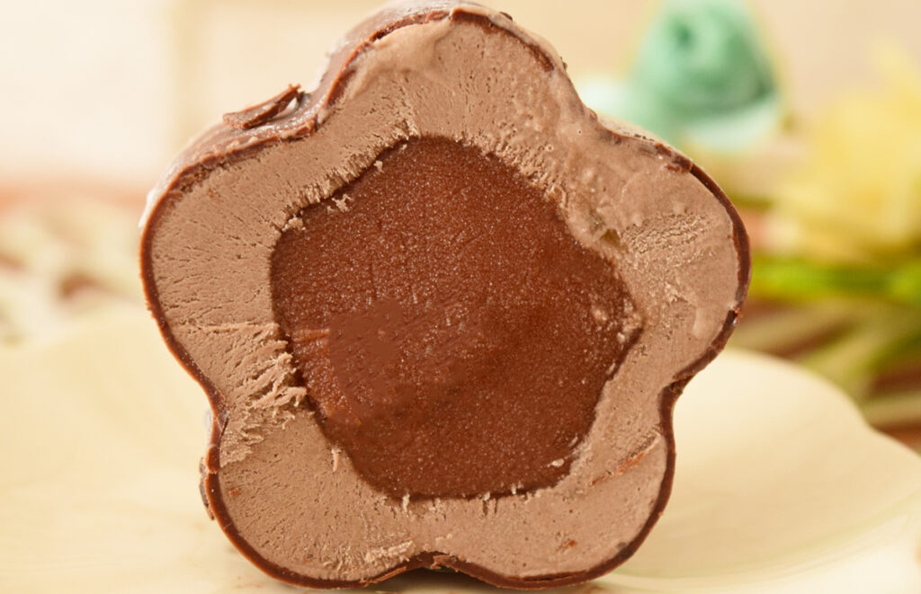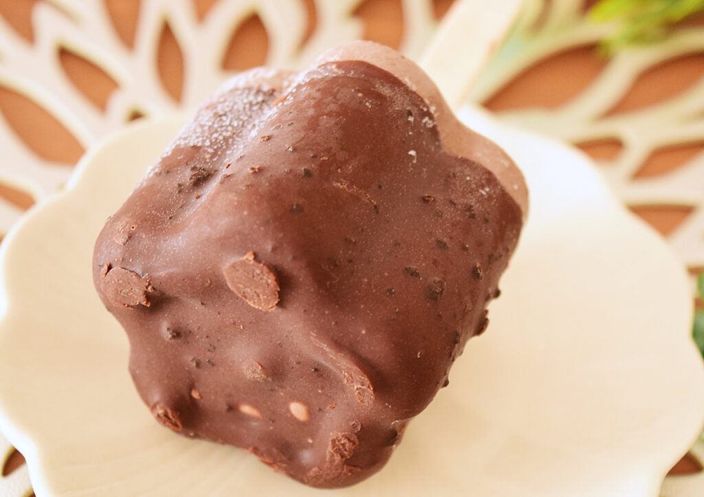 中にはチョコあんとアプリコットソースが入りのチョコアイスが、表面はザッハトルテを再現したのだというクッキークランチ入りのチョコレートでコーディングされていますよ。