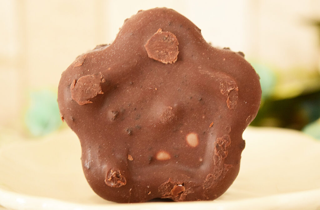 形はノーマルなあいすまんじゅうと同じく、花びらのようですね。表面のゴツゴツはクッキークランチ。クッキークランチがあることで、食感にメリハリが出て◎