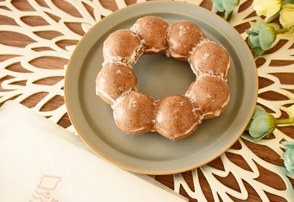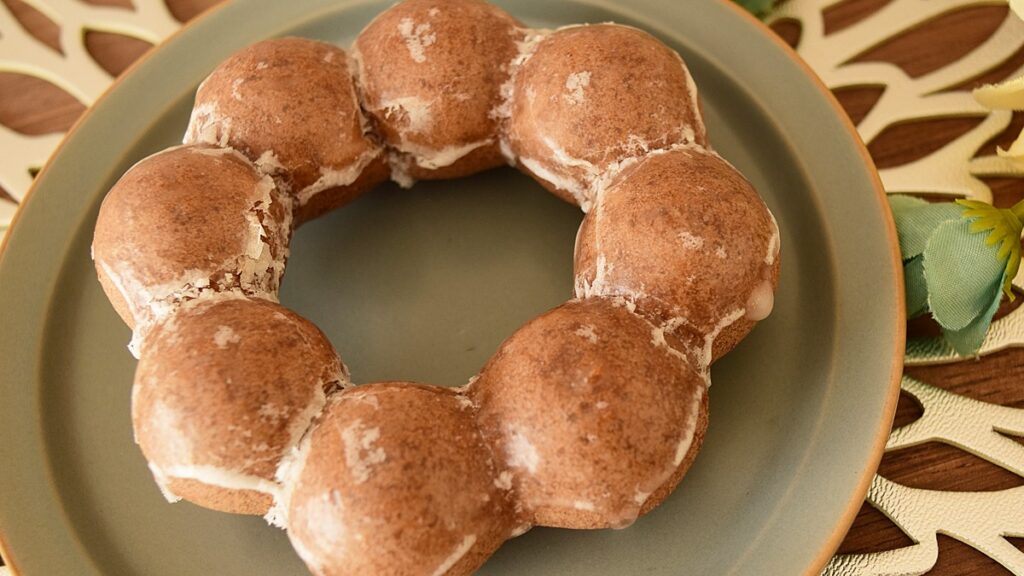 今回はその中の「ポン・デ・ショコラ」を実食しました。ポン・デ・ショコラの見た目や形はポン・デ・リングとほぼ同じです。グレーズコーディングされていて、生地の色合いがココアっぽいのが特徴的ですね。