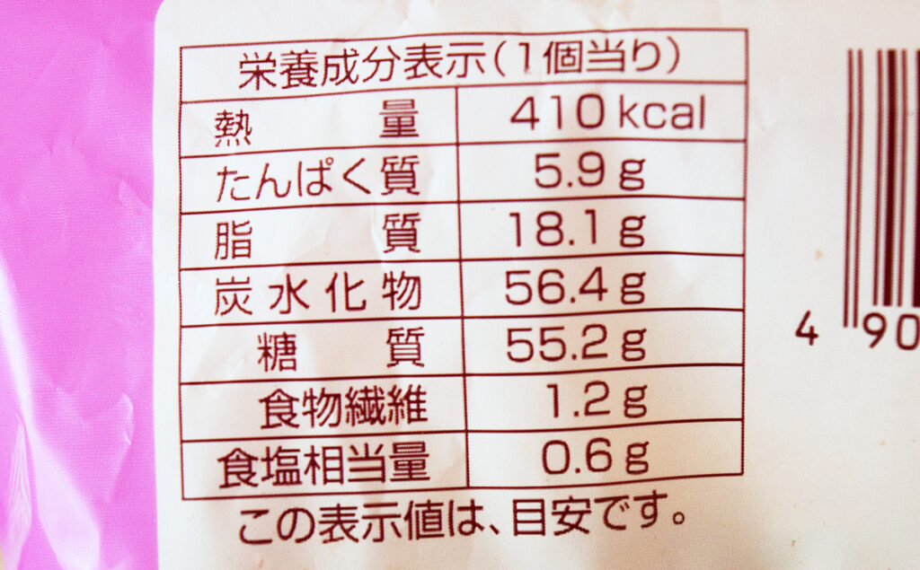 1個あたり410kcal。たんぱく質5.9g・脂質18.1g・炭水化物56.4g・食塩相当量0.6g。
