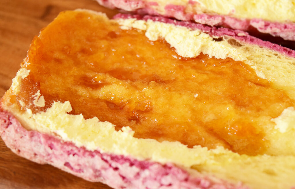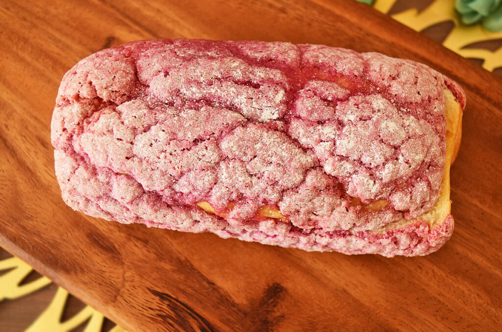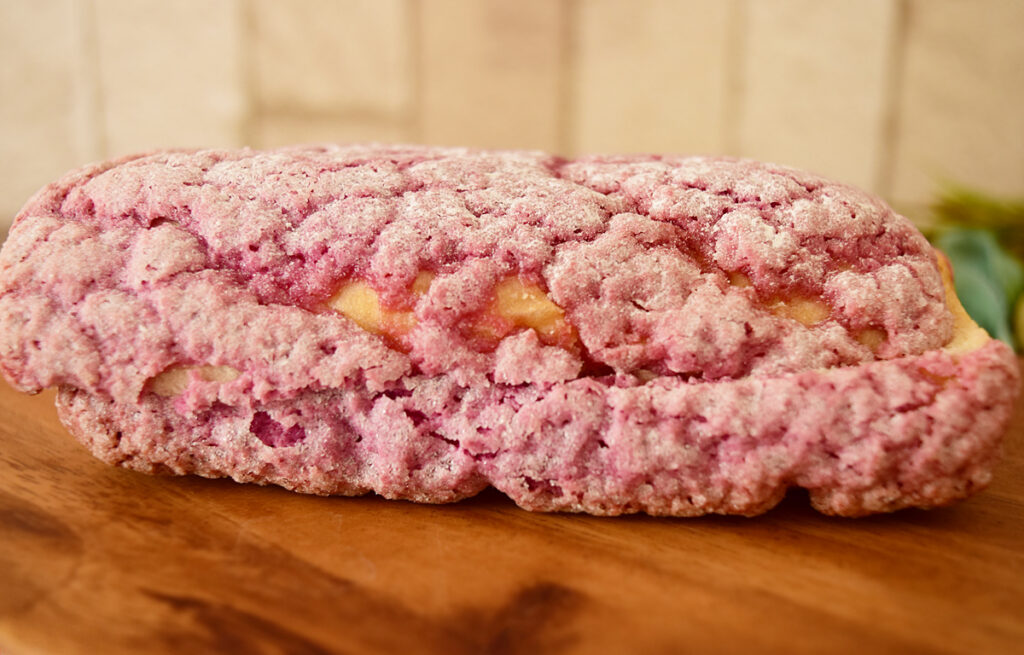 凹凸のあるパンの表面は、紫いも風味のマカロン生地。
