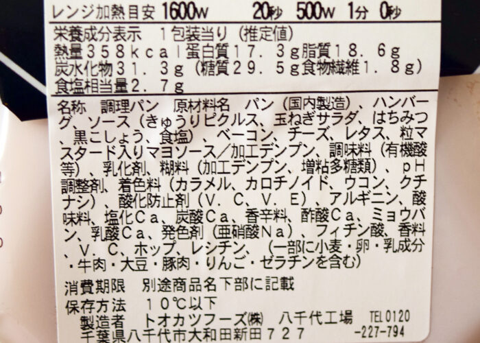 調理時間は500Wの電子レンジで1分。1個当たり358kcal。糖質は29.5gで食塩相当量は2.7g。原材料を見ると粒マスタード入りのマヨネーズが味付けに使われていますね。
