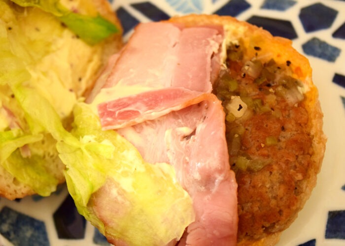こちらが調理後の「ベーコンレタスチーズバーガー」です。レタスやベーコンがはみ出ています。おいしそう!