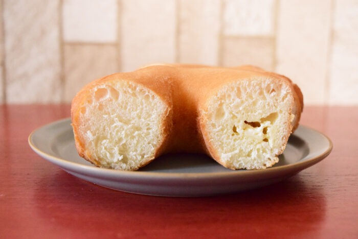 一部にはチーズが入っています。そのまま食べると若干パサついていますが、弾力がありそれはそれで美味しいです。甘いドーナツかと思いましたが、甘さは全くないプレーン味。電子レンジで温めると、なかのチーズがトロっとして生地も弾力がありながらふわふわして、さらに美味しくなりました。温めて食べると非常に美味しいですね。ボリュームもそれなりにあり半分だけ食べてもおやつとしては十分な量でした。
