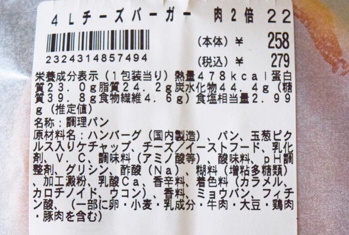 1個当たり478kcal。糖質は39.8gで食塩相当量は2.99gでした。