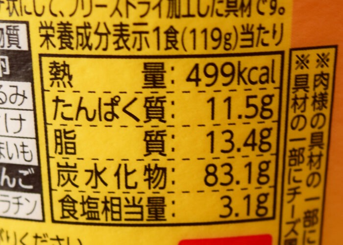1食(119g)あたり499kcal。炭水化物は83.1gで食塩相当量は3.1g。