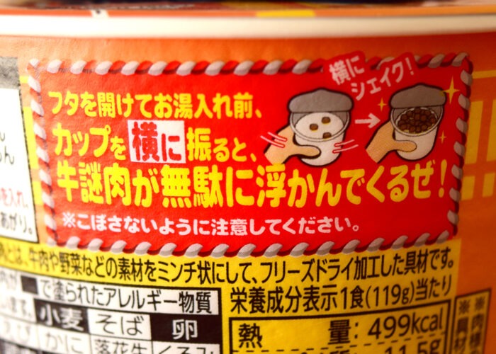 カップを開けて横に振ると、たしかに牛謎肉が浮かんできました。調理時間は5分。