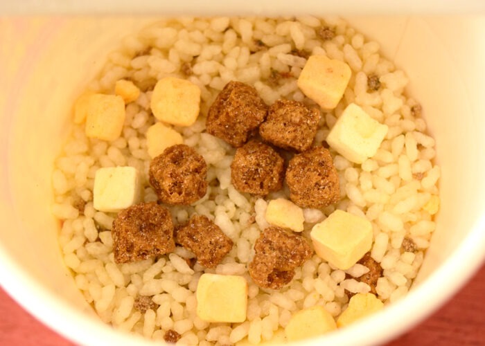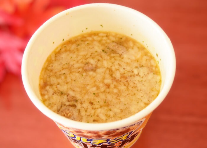 味や謎肉はいいですが、ご飯は違和感が強め。乾燥ご飯の限界ですね。この味でカップヌードルの麺だったらかなり美味しいかもしれません。