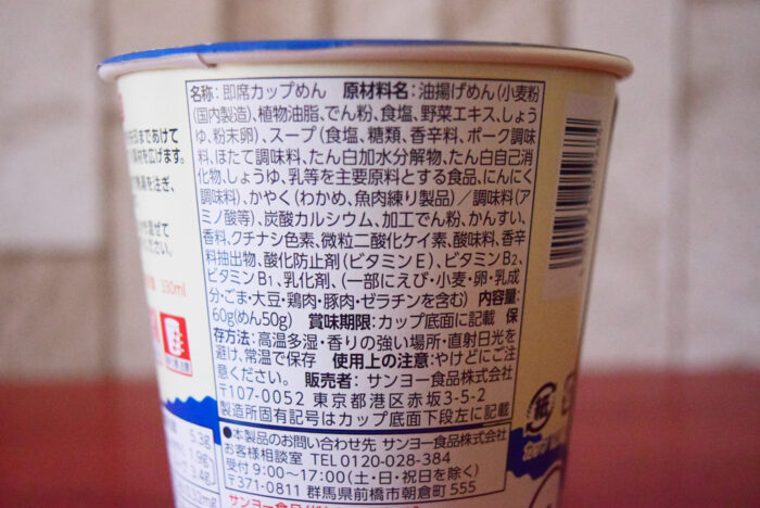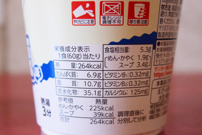 1食(60g)当たり264kcal。たんぱく質6.9g・脂質10.7g・炭水化物35.1g・食塩相当量5.3g(めん・きゃく1.9g・スープ3.4g)です。