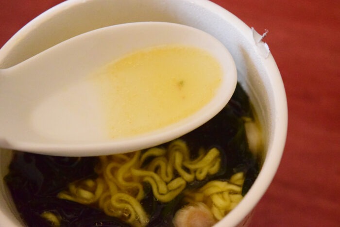 ほたて出汁が効いて美味しい塩スープです。少し高いカップ麺の塩スープ(塩元帥など)にも似ていています。一番近いのは「エースコック わかめラーメン 北海道産ホタテだし塩 」ですかね。ホタテのだしとわかめが上手にからんで美味しいスープでした。