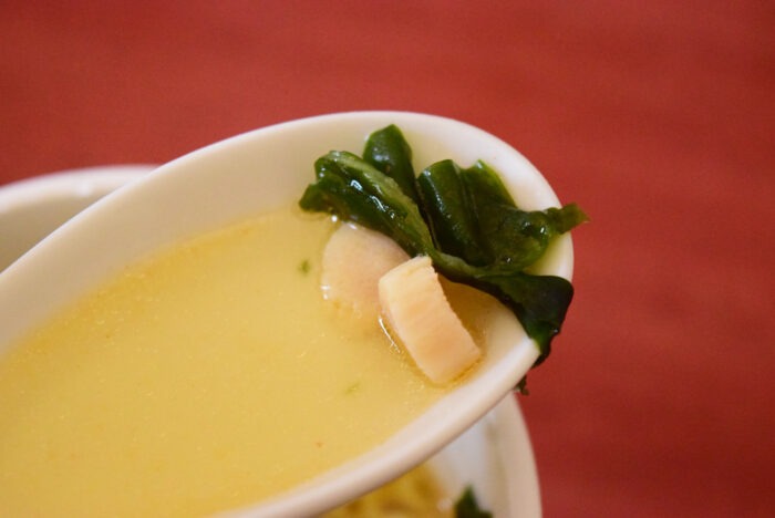 完成品はこちら。わかめやほたてなどの具材が多く、ホタテ出汁のおいしそうな香りが漂います。