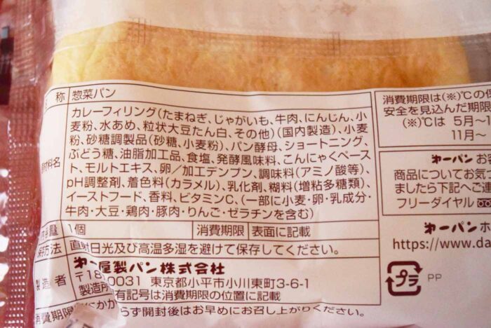 原材料にはたまねぎ・じゃがいも・牛肉・にんじん・小麦粉・水あめ・粒状大豆たんぱく・その他・小麦粉・砂糖調整品・パン酵母・ショートニング・ぶどう糖などが含まれています。