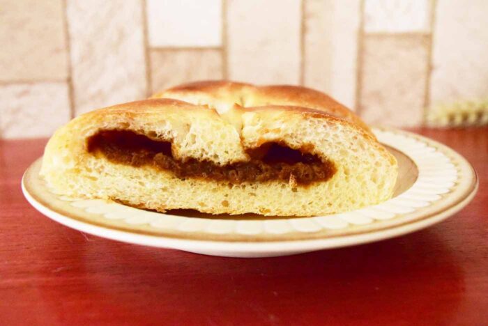 パンの中にはカレーがそれなりに入っています。食べてみましたが、特に牛すじの香りや味はなく普通のカレーです。具材もしっかり入っているわけでなく、非常に細かいため入っているかどうかもよく分かりません。正直、牛すじカレーと言われなければ、絶対に気が付かないであろうくらいしか入っておらず、箸でカレーの中を探してみてもそれらしいものは見つかりませんでした。カレー自体は甘くもなく、辛くもなく非常に食べやすいのが特徴です。パン生地は揚げていないため、油っこくないところがいいですね。ふっくらしたパン生地はカレーとよく合っています。