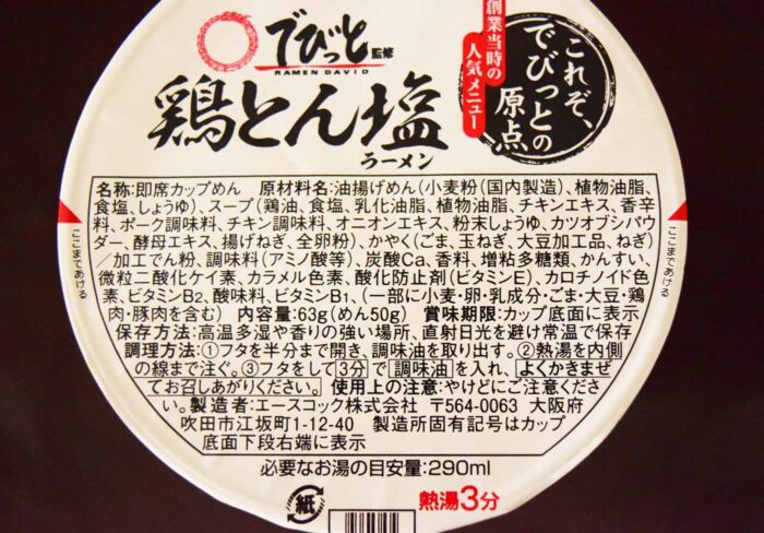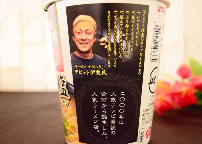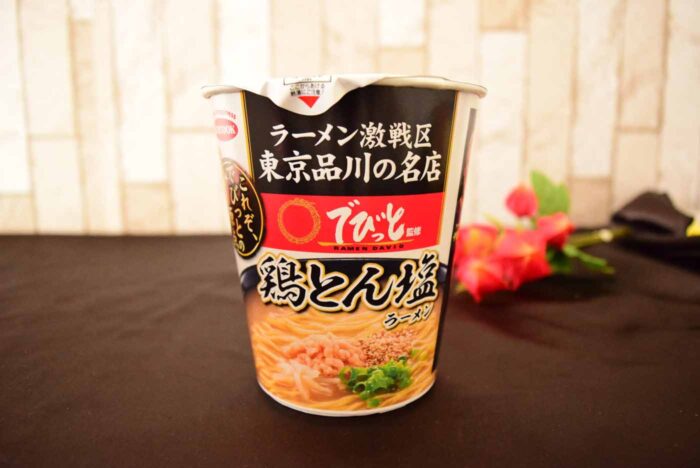 今では4店舗経営し、毎月のようにキッチンカーでも出店するほど人気店に成長したのはすごいですね。そんなデビット伊東氏ですが、現在も神奈川にある真鶴伊藤商店で厨房に立っているそうです。本人が厨房に立っているときのみオープンしているそうですよ。さて、そんなデビット伊東氏のお店である「でびっと」が監修したラーメンが「でびっと監修 鶏とん塩ラーメン」です。スーパーで激安価格98円(税抜)で販売していたので、思わず手に取ってしまいました。