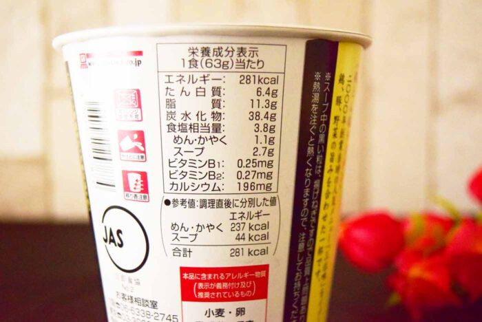 1食(63g)当たり281kcal。食塩相当量は3.8g(めん・かやく1.1g、スープ2.7g)。