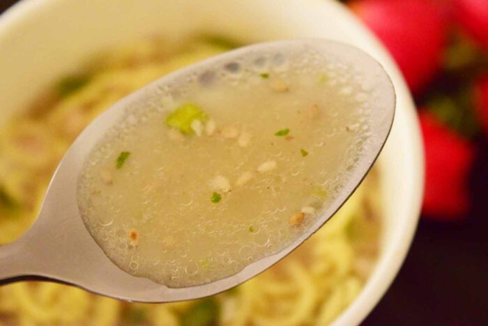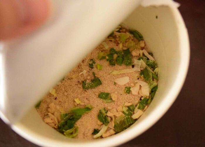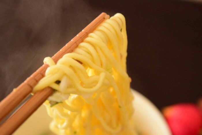 麺とスープは一緒に入っています。湯戻し時間は3分です。