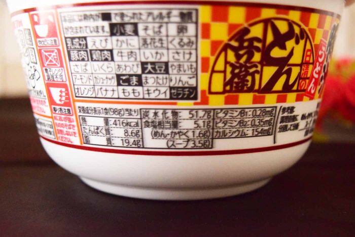 1食(98g)当たり416kcal。たんぱく質8.6g・脂質19.4g・炭水化物51.7g・食塩相当量5.1g(めん・かやく1.6g・スープ3.5g)です。