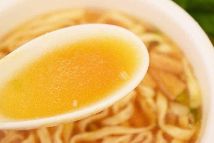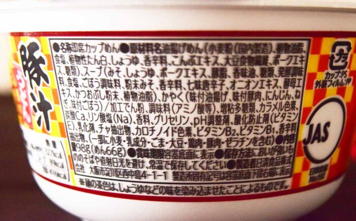 麺は「しょうゆ・昆布エキス・ポークエキス」が原材料に含まれています。昨年はこれらの原材料が入っていないかったので、麺が大きくバージョンアップしています。スープは「みそ・しょうゆ・ポークエキス・豚脂」がメインに入っていて、これらの順番は昨年と変わっていませんでした。