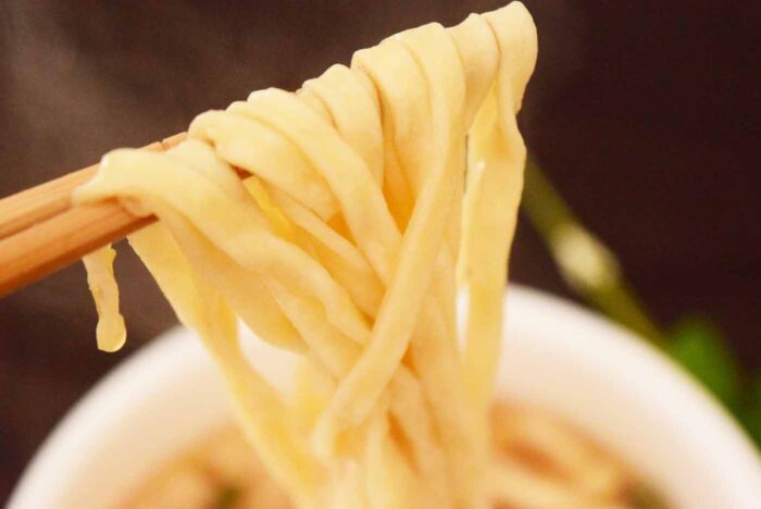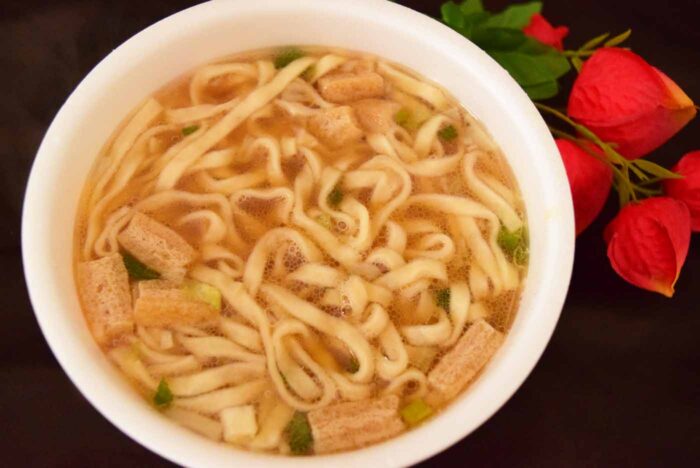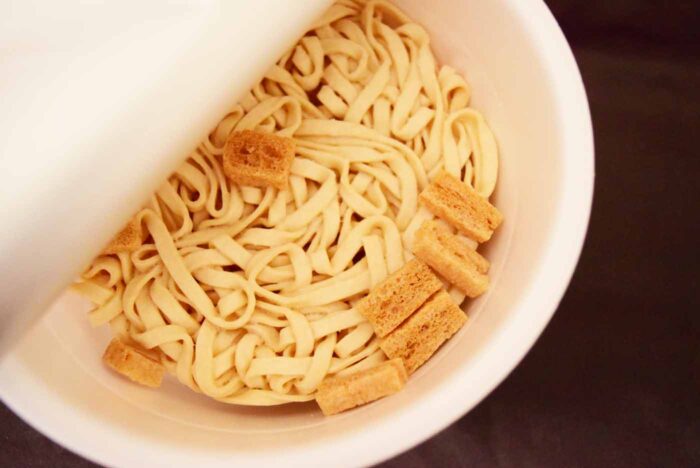 麺の色は少し茶色いですね。湯戻し時間は5分です。
