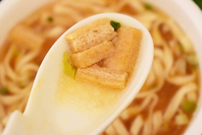 味付き油揚げ、味付き豚肉、にんじん、ねぎ、味付きゴボウが入っている具材ですが、油揚げが目立ちます。他の具材はほとんど入っていません。もう少し豚肉が欲しいところです。