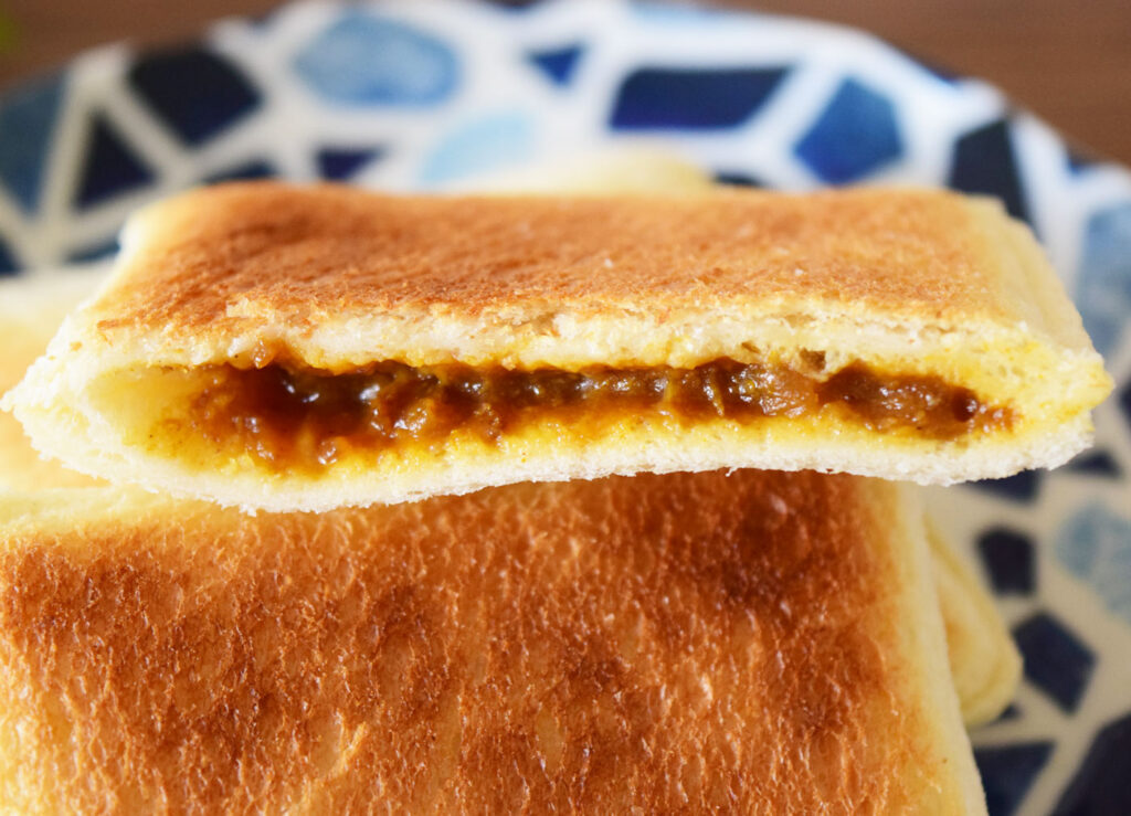 ほのかにカレーのにおいがしました。見た目はいつものスナックサンド。中身はカレーなので、カレーパン的な味わいを目指して少しだけ焼いてみました。
