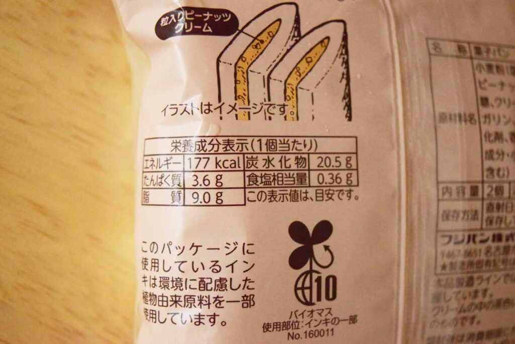 生クリームが練り込まれた食パン生地に粒入りピーナツクリームが挟まっています。1個当たり177kcal。炭水化物は20.5gで食塩相当量は0.36g。