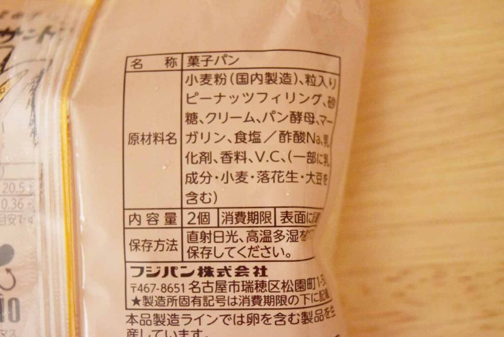 原料には小麦粉・粒入りピーナッツフィリング・砂糖・クリーム・パン酵母などが入っています。