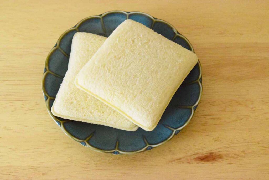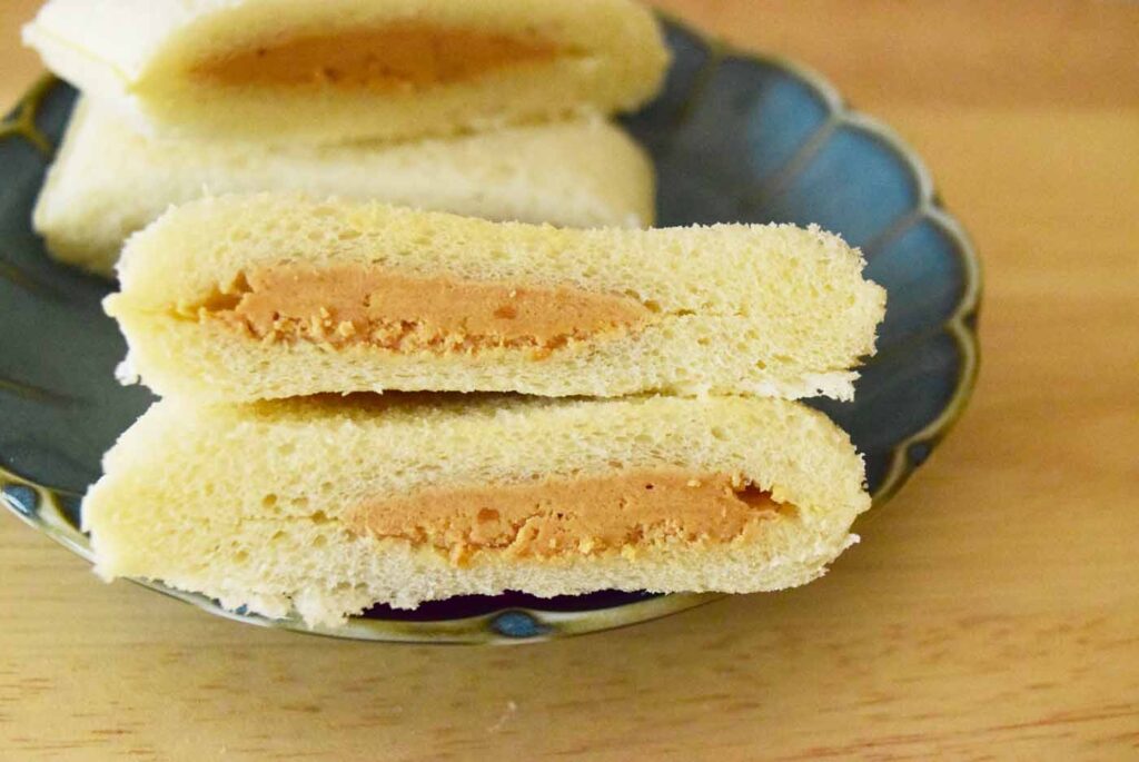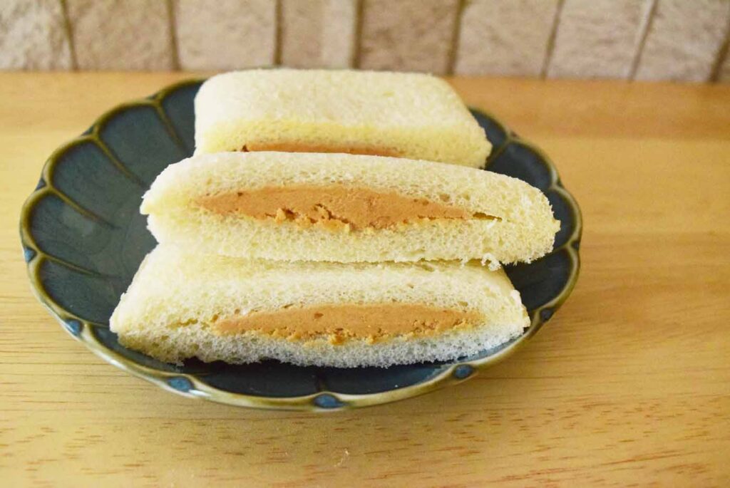次に横からカット。こちらは結構偏りが見えます。ただ、それなりに分量はある方ではないでしょうか。味はピーナツクリームは普通のスナックサンドピーナツクリームとほとんど変わりません。ねちょっとしたクリームではなく、少し砂糖が入っているような甘めのシャリっとした食感が特徴的。ピーナツの味はそこまできつくなく、あくまでも風味程度といったところでしょうか。パン生地はふわっと柔らかく、食べやすい印象を受けました。