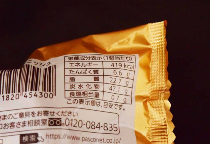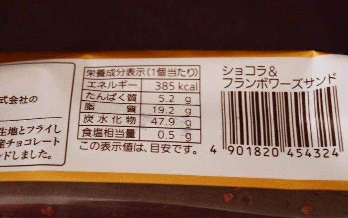 1個当たり419kcal。炭水化物は47.1gで食塩相当量は0.7g。公式HPによると原材料には「チョコレートスプレッド、準チョコレート、チョコレート」などが含まれています。