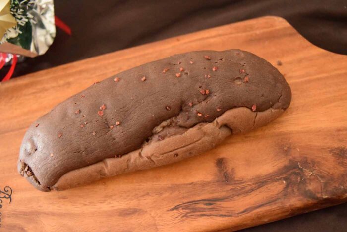 見た目は茶色いコッペパンみたいですね。表面の粒々がカカオニブみたいです。