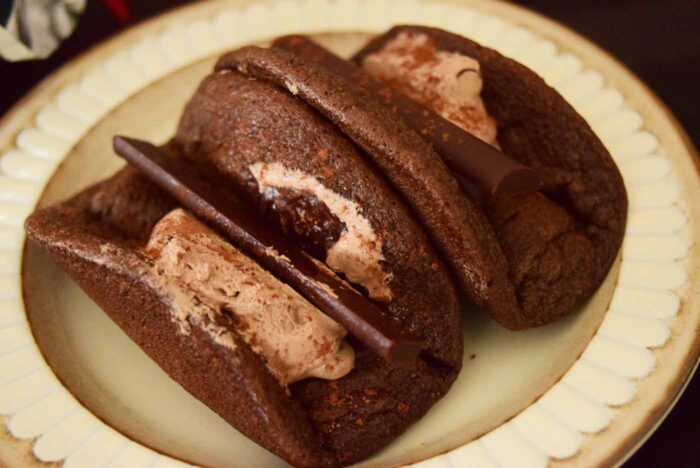 オムレット生地の間にはチョコレートクリームとチョコレートが挟まっています。