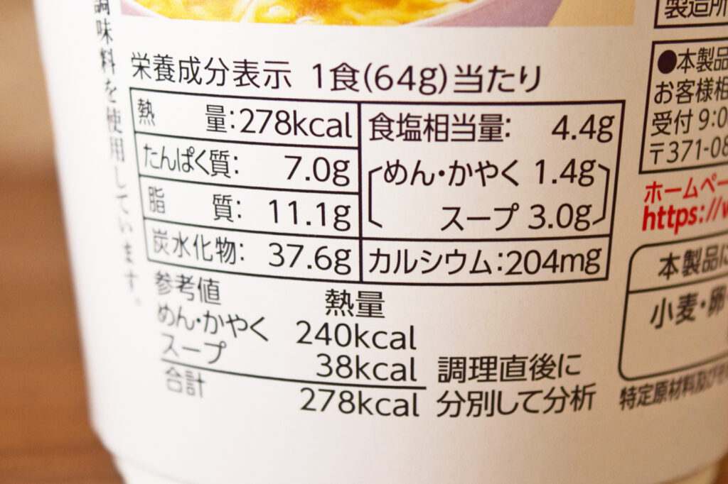 1食(64g)あたり278kcal。食塩相当量は4.4g(めん・かやく1.4g、スープ3.0g)です。
