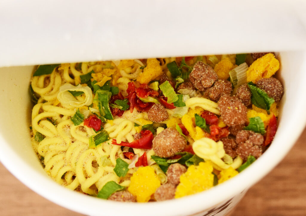 お湯を入れて3分後。完成品がこちらです。赤ピーマンと牛テールスープの香りが鼻をくすぐります。