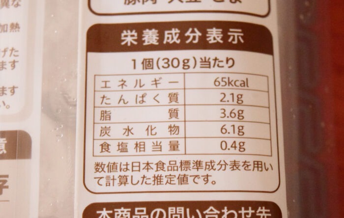 1個(30g)当たり65kcal。たんぱく質2.1g・脂質3.6g・炭水化物6.1g・食塩相当量0.4gです。