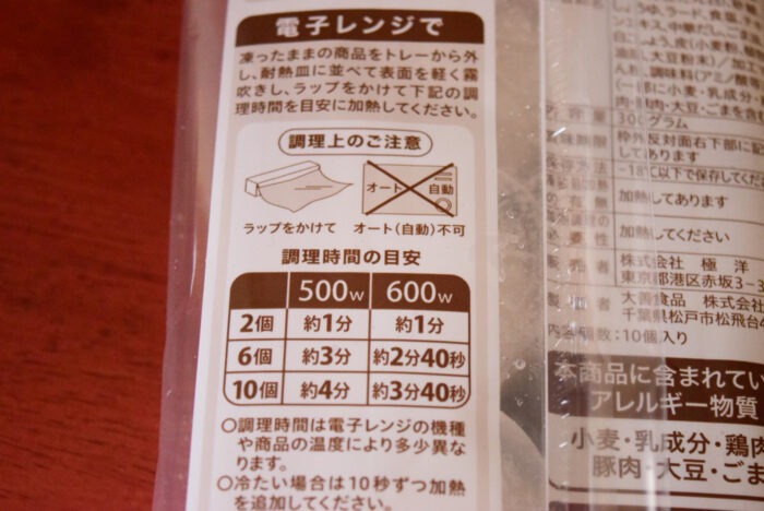 電子レンジでラップをかけて温めるだけで完成します。今回は10個全て調理しました。