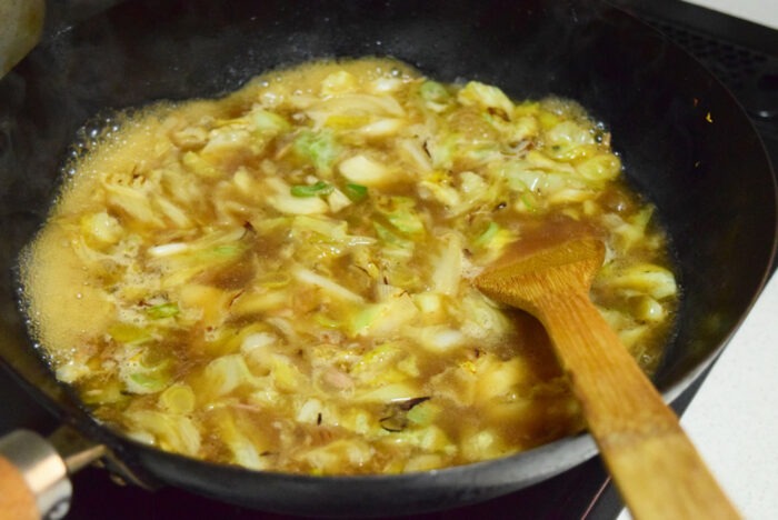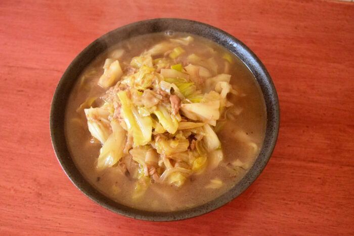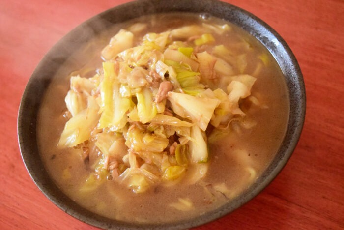 上記具材を炒めた後、スープを入れて煮込むだけ。アレンジとしては手間がかからず簡単です。麺をゆでる時間で完成しました。包丁が面倒な人はカット野菜でアレンジがおすすめです。