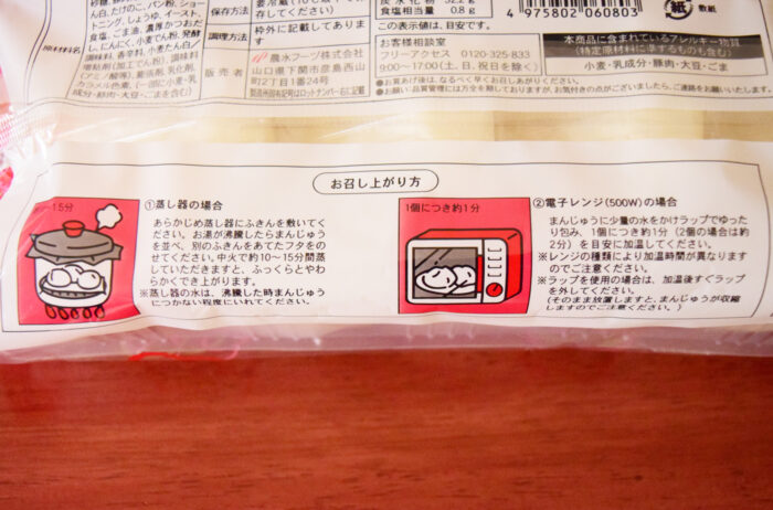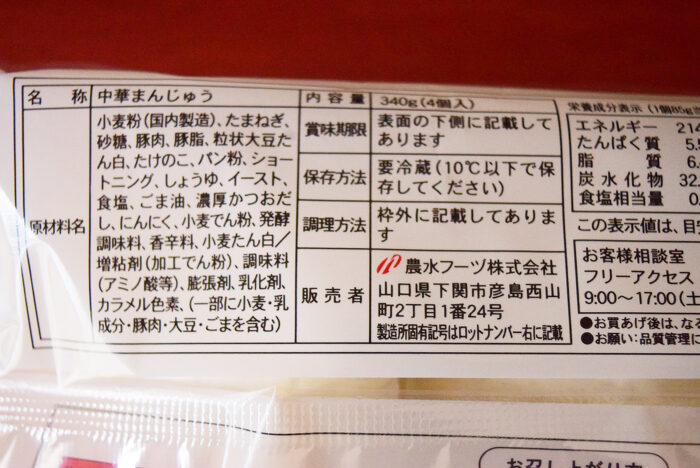 原材料には小麦粉・たまねぎ・砂糖・豚肉・豚脂・粒状大豆たんぱく・たけのこ・パン粉・ショートニング・しょうゆ・イースト・食塩・ごま油・濃厚鰹だしなど含まれています。