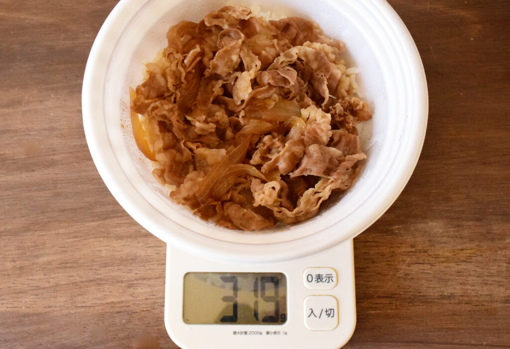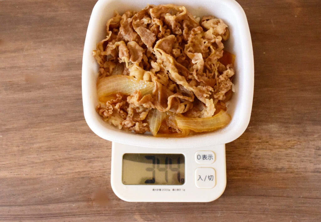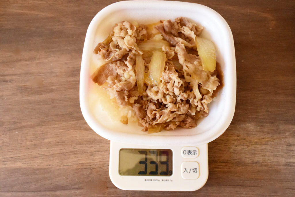 重さを見ていきましょう。まずは吉野家。344gありました。
