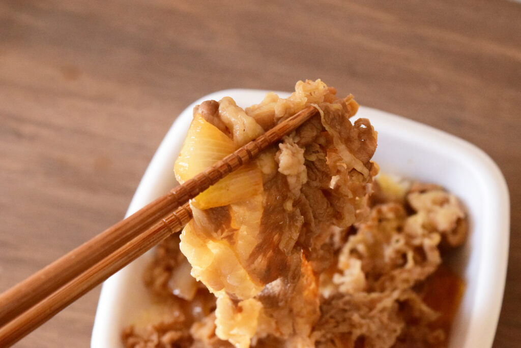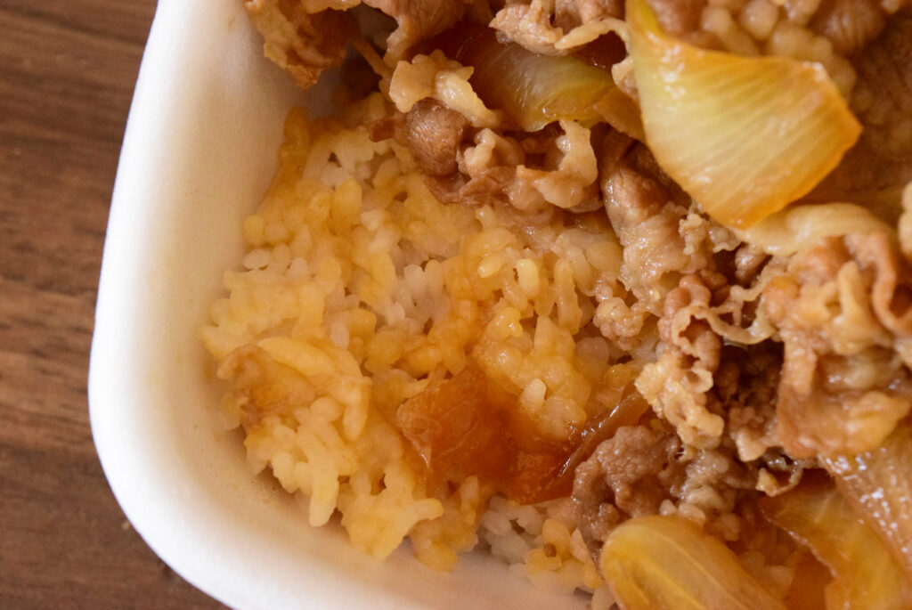 生姜の味が効いていて醤油味は薄いです。色が薄いですが出汁はしっかりついています。玉ねぎにたれがあまり染み込んでいなくて少し固めなのが特徴。生姜の香りが強い牛丼のため、他の2社とはだいぶ味が異なりました。ただし、2020年の方が生姜はきつかったです。