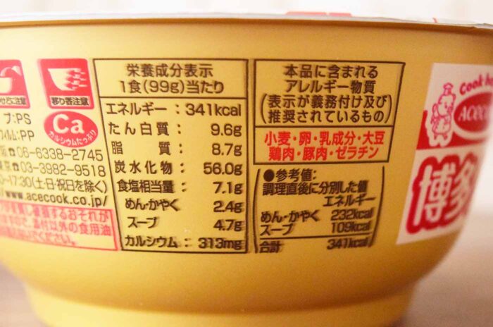 1食(99g)あたり341kcal。炭水化物は56.0gで食塩相当量は7.1g(めん・かやく2.4g、スープ4.7g)でした。