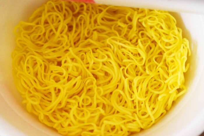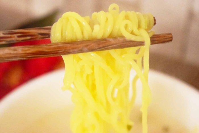 麺は丸刃のノンフライ。湯戻し時間は4分でしなやかな弾力とコシを併せもっているとのこと。