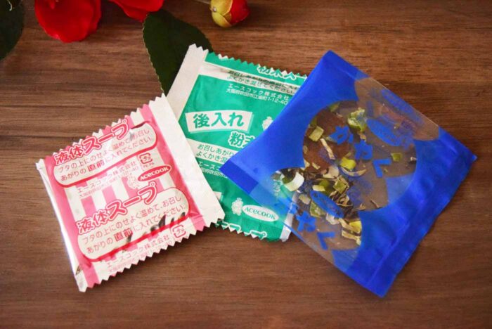 かやくの他に後入れ液体スープと粉末スープが入っていました。粉末スープは、なかなか溶けないのでしっかりかき混ぜないと駄目との事です。