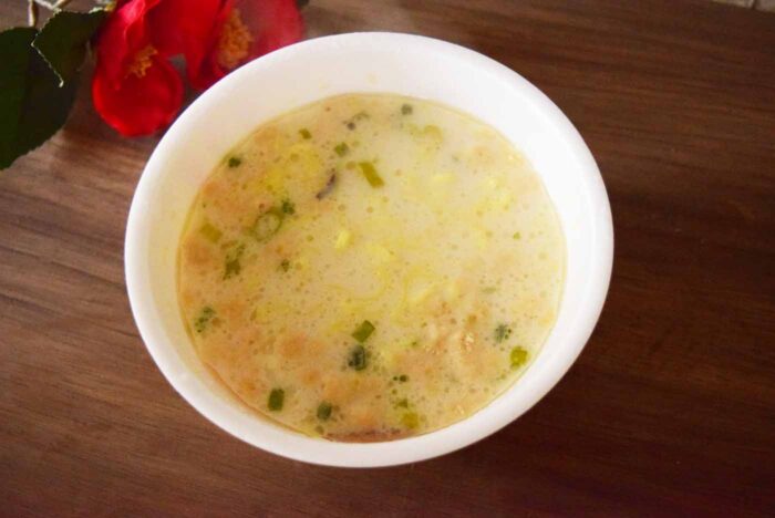 完成品がこちら。結構かきまぜたので泡立っています。よくみると何か塊が浮いていますね。