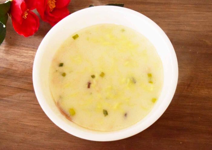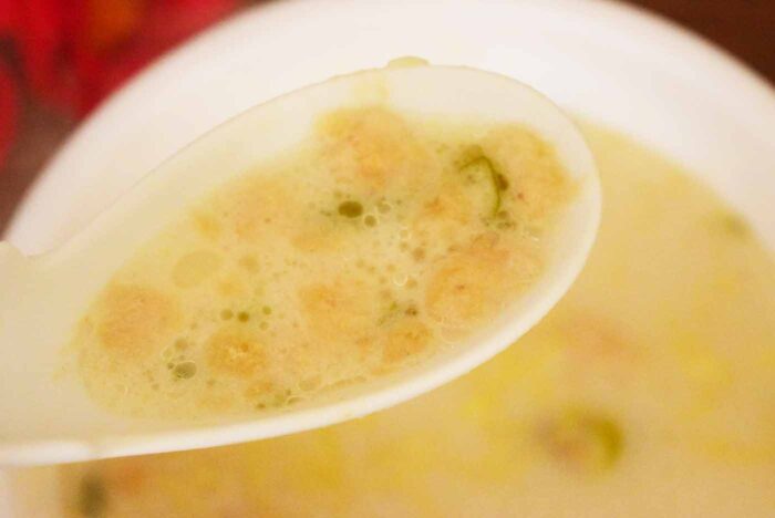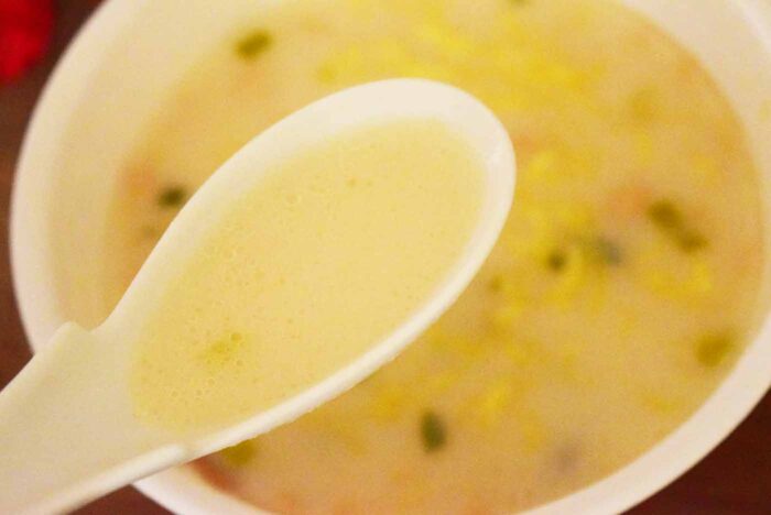 再度しっかり溶けるまでかき混ぜてみました。スープの色が真っ白になりましたね。
