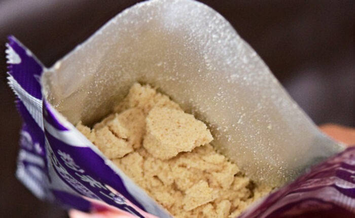 粉末ソースを開けてみました。この状態ではハッピーターンの香りはほとんどしません。粉末調味料の香りがします。