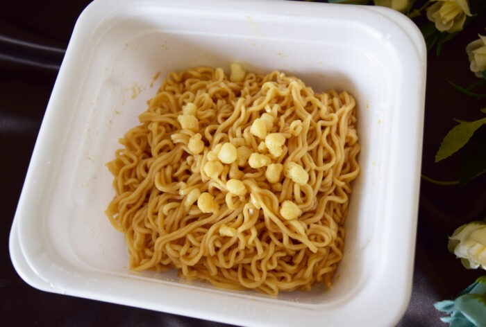 3分後。できあがりはこちら。見た目はシンプルな塩焼きそば。匂いはハッピーターンです。不思議ですねぇ…