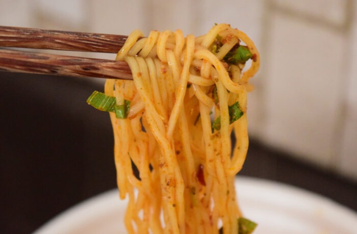 4分後、お湯を捨てて具材をすべて入れて混ぜたら完成です。山椒の香りが食べる前から漂ってきます。