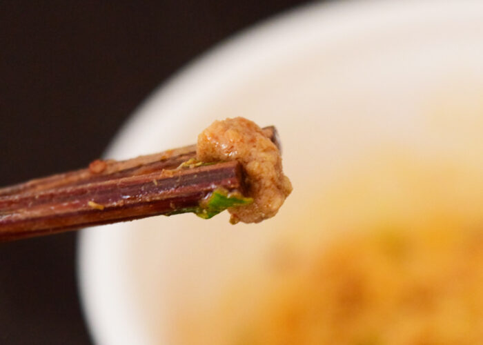 山椒の香りが鼻を通り、舌が軽くしびれます。辛さはそこまできつくないものの、山椒がかなり効いている感じですね。胡麻の旨みと坦坦味噌の味とコクはしっかり出ていて、辛いだけでなく、うまいタレの味になっています。