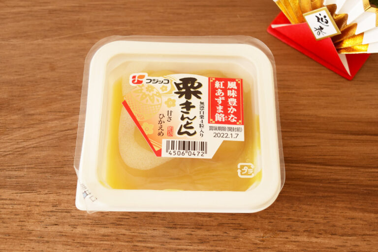 今回は、フジッコ「おせちミニカップ栗きんとん」を購入してみました。紅あずま餡を使用した甘さ控えめの栗きんとん。栗は4粒入っています。