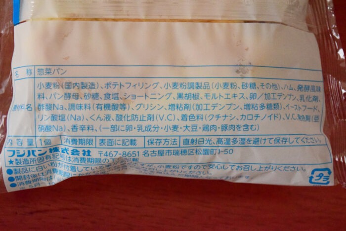 原材料には小麦粉・ポテトフィリング・小麦粉調製品・ハム・発酵風味料・パン酵母・砂糖・食塩・ショートニング・黒胡椒・モルトエキス・卵など使用しています。